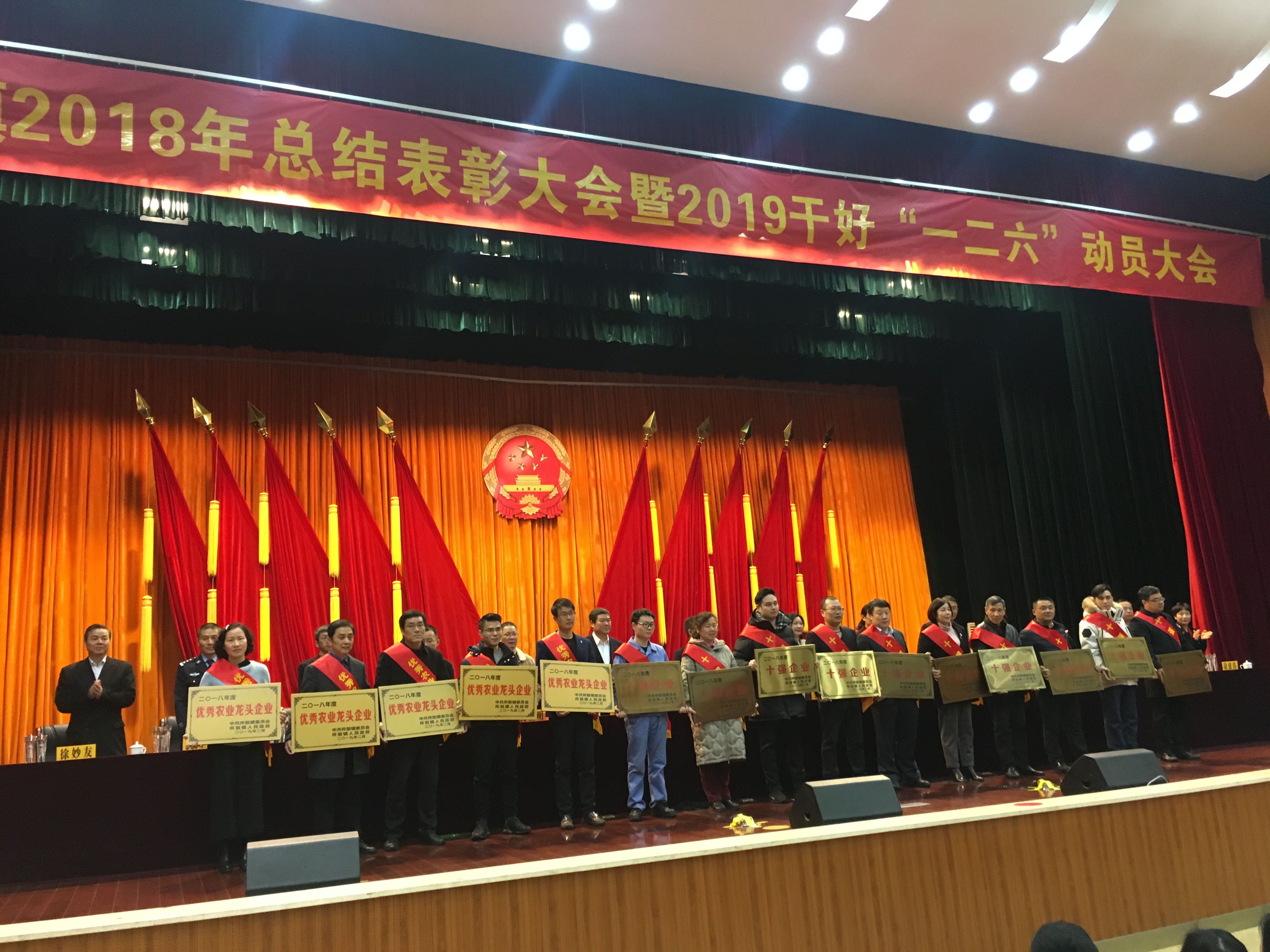 2019年2月15日,蕭山區所前鎮為總結經驗、表彰先進,進一步動員廣大干部群眾振奮精神、真抓實干、開拓創新,推動經濟社會各項事業發展再上新臺階,隆重召開2018年總結表彰大會暨2019干好“一二六”動員大會,浙江華成控股集團有限公司榮獲2018年度所前鎮“稅收十強企業”和“十強企業”兩項表彰,沈波總裁受邀參加大會并上臺領獎。